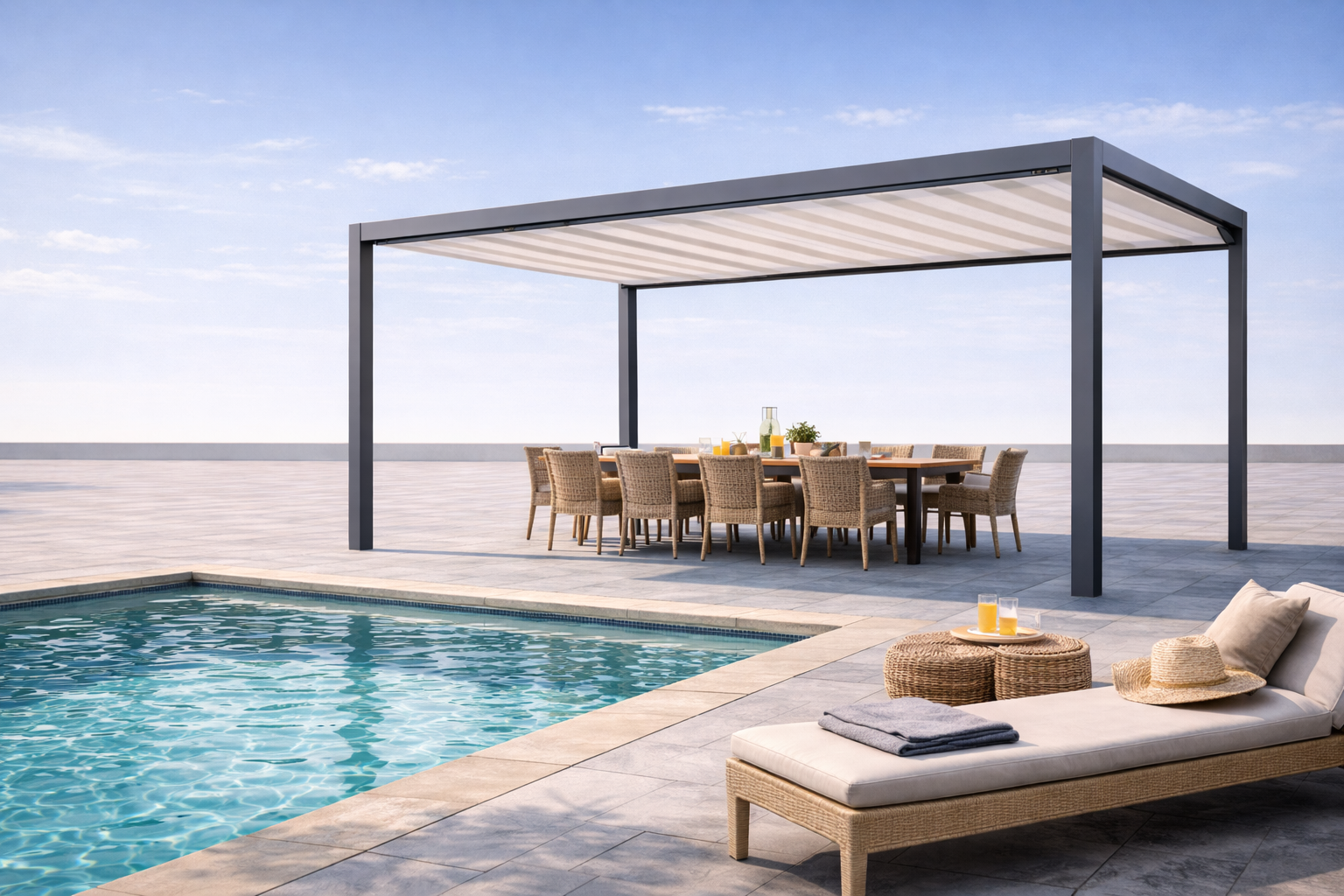Per chi vuole trasformare il giardino in una vera stanza all'aperto, proponiamo strutture robuste e resistenti agli agenti atmosferici, capaci di creare zone d'ombra ampie e stabili.